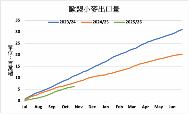 商品研究公司Expana報告表示,自2025/26年度開始以來,歐盟軟質小麥出口相當疲軟,原因是來自俄羅斯小麥的強大競爭以及中國進口不足。在其9月報告中,Expana將2025/26年度歐盟軟質小麥產量預估為1.361億公噸,比8月的預測高出330萬噸。這一數字較2024/25年度增長19.8%,並超過2015年的前紀錄1.356億噸。